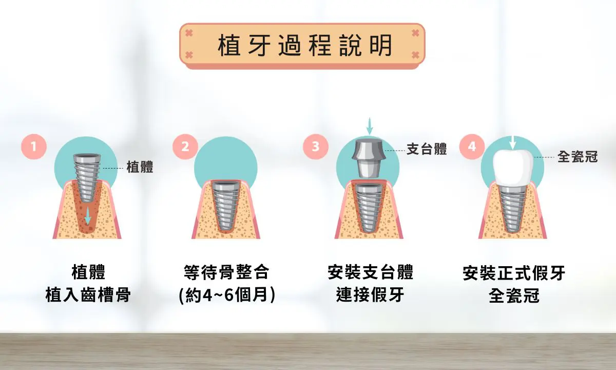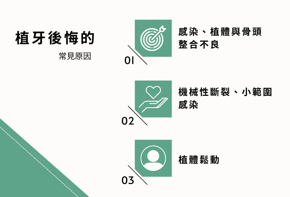 - 感染、植體與骨頭整合不良:重新處理或調整,如清除感染、補骨或使用更適合的植體